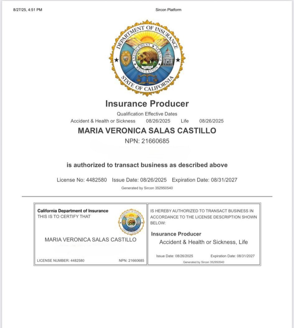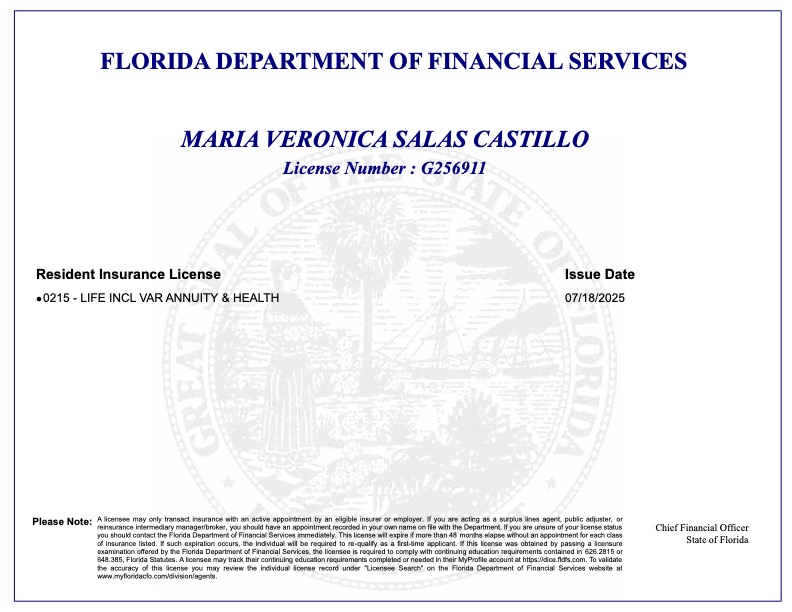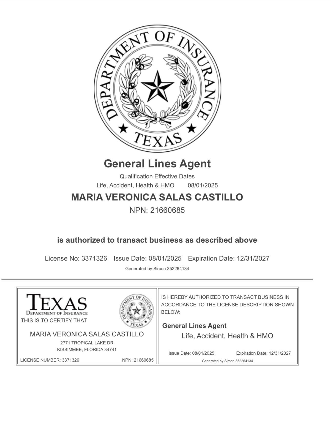 Soy un agente de seguros licenciado en más de 10 estados de los Estados Unidos, cumpliendo con todos los requisitos y regulaciones tanto a nivel estatal como federal.